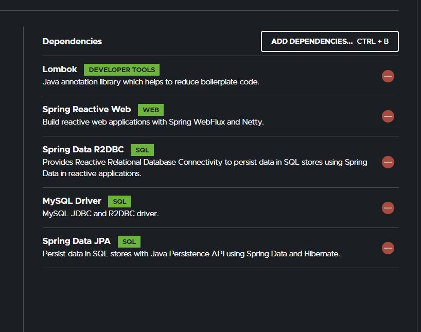 Spring Initializer에서 MySQL + JPA + R2DBC를 선택할 시 아래와 같은 디펜던시를 설정해준다